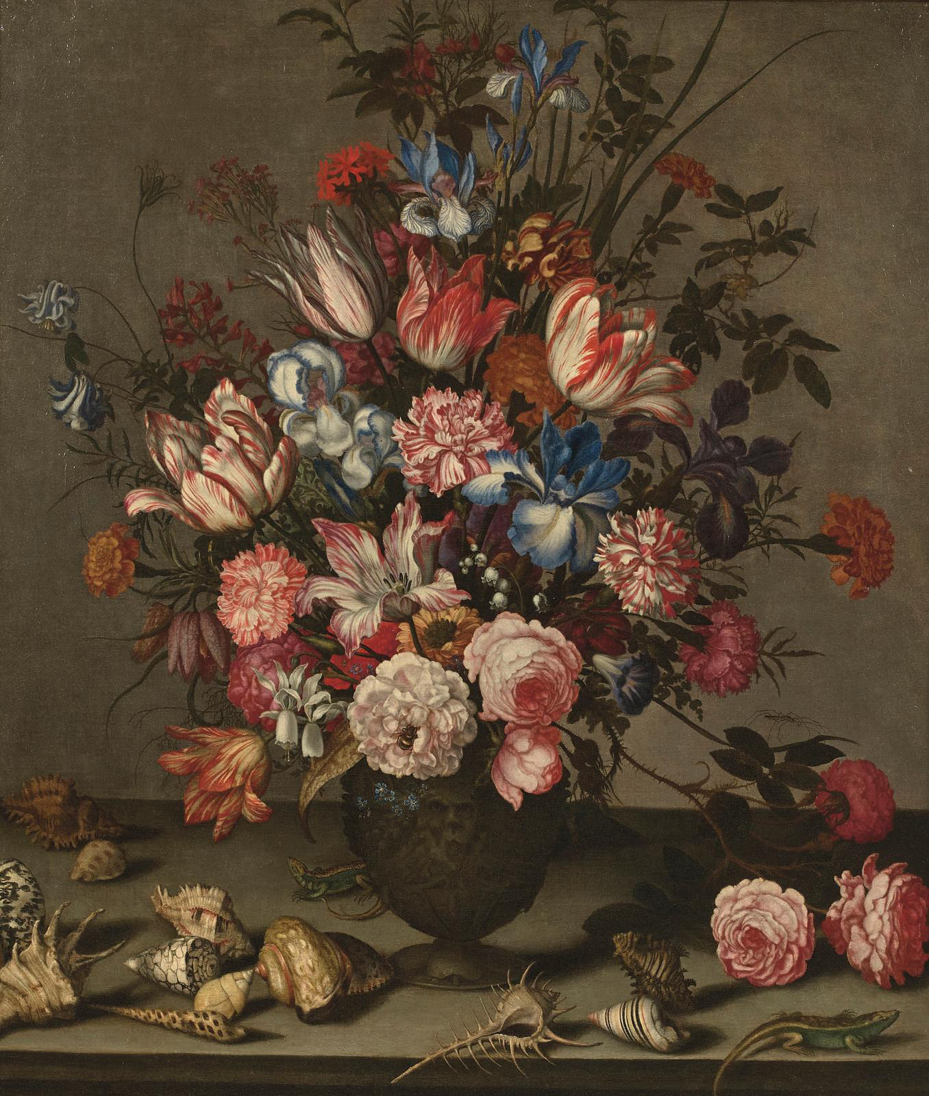 Iris tulipes oeillets rose et autres fleurs dans un vase sculpte avec coquillages et lezards sur un entablement