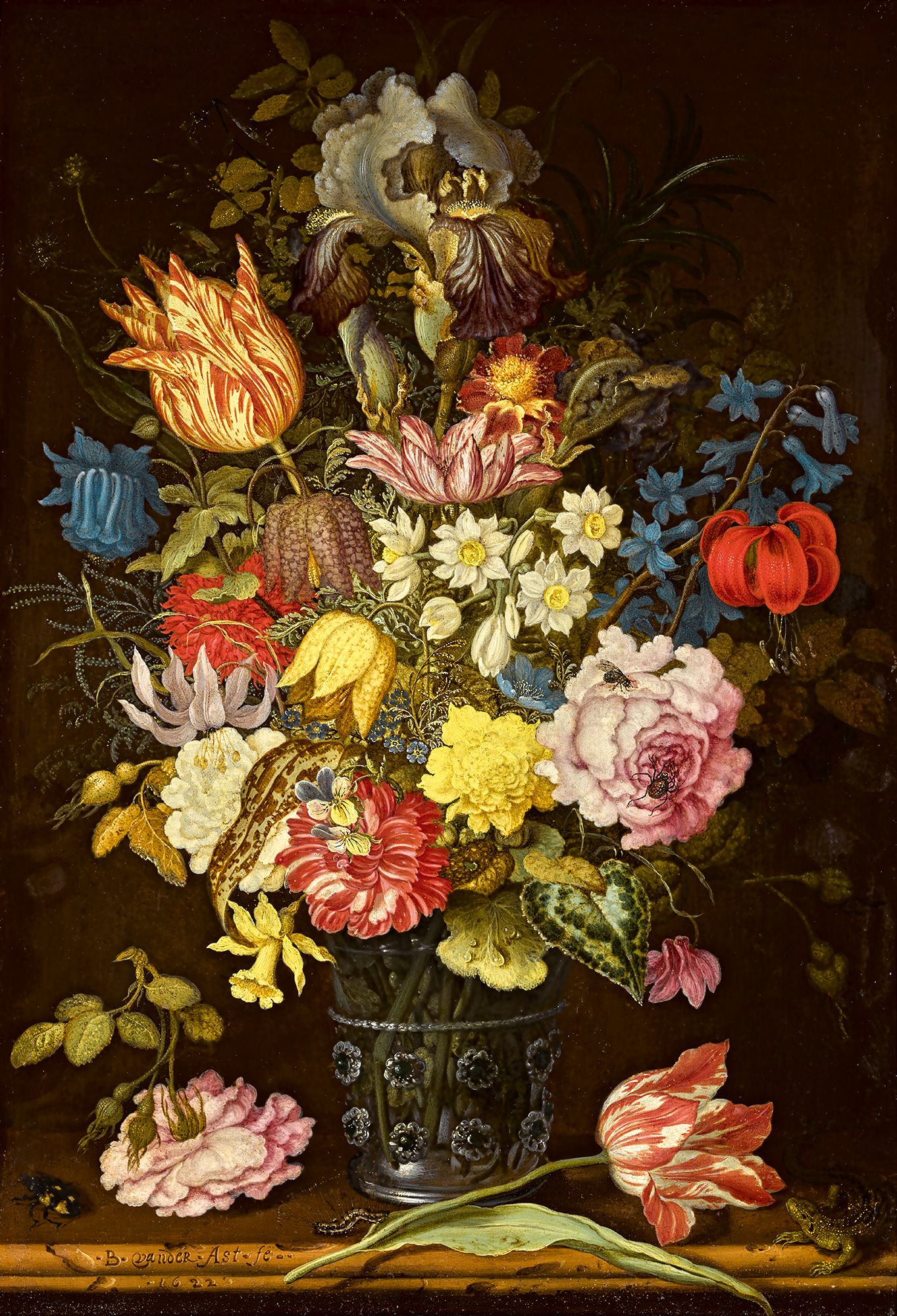 A distinguished example of Baroque Art painting, Still life of flowers in a glass beaker on a stone ledge together with insects and a lizard 1622 by Balthasar van der Ast eloquently conveys the essence of Flower Painting through balanced composition and nuanced detail.