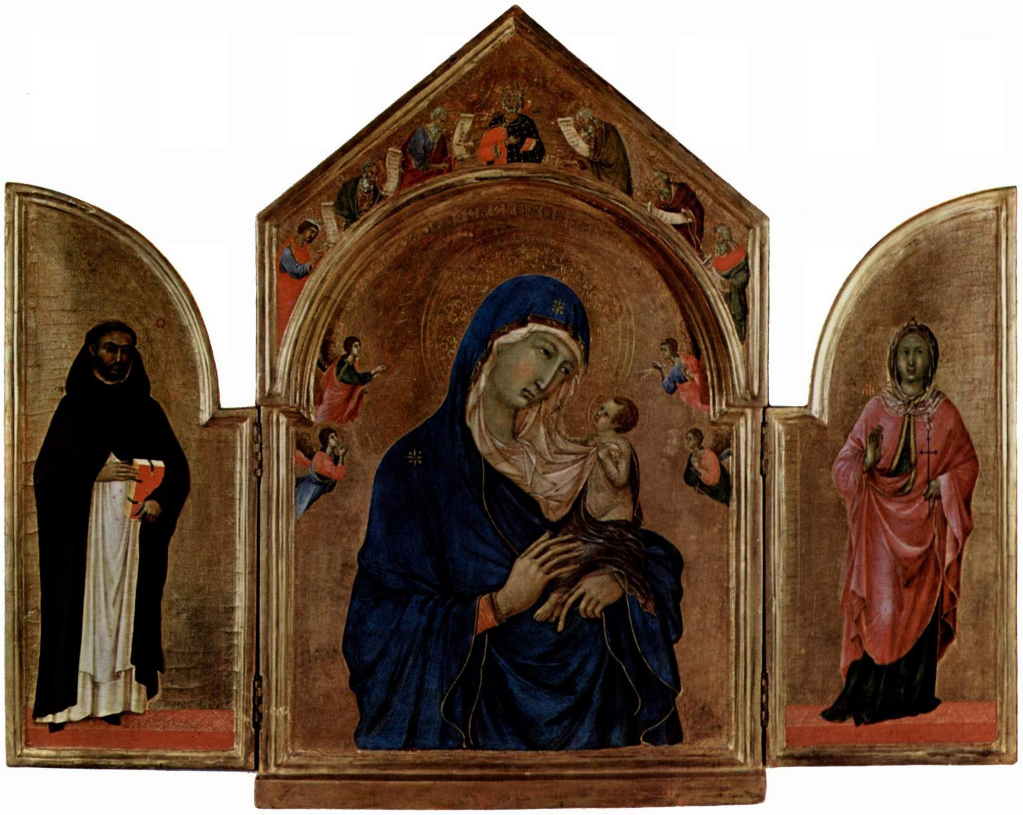 Created by the influential artist Duccio, London triptych madonna with angels and prophets 1305 captures the spirit of the Renaissance-Early tradition.