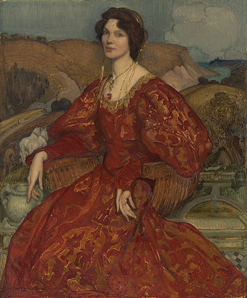 Experience the distinct atmosphere of Woman painting as portrayed in Sybil waller in a red and gold dress 1905. Created by the visionary George Washington Lambert, this work is a celebrated contribution to the Symbolism tradition, admired for its emotional depth.