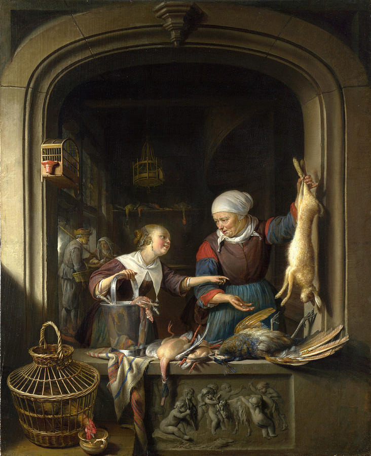 A poulterers shop by Gerrit Dou is a hand-painted oil painting reproduction depicting Genre painting in the style of the Baroque Art.