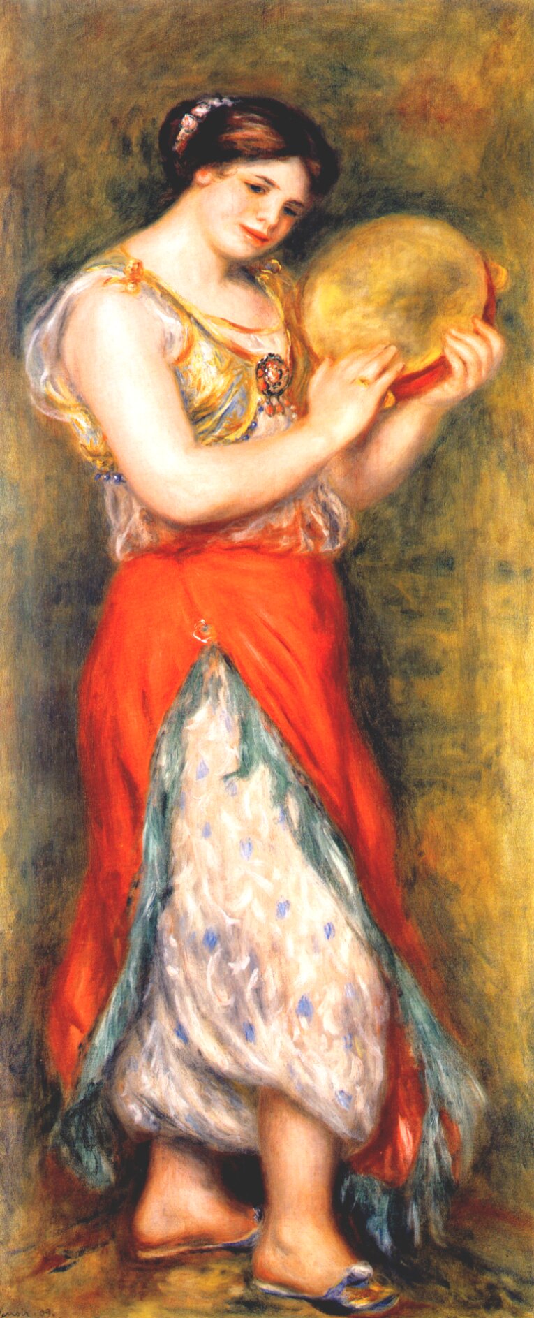 Dancer with tambourne gabrielle renard 1909 is a meticulously hand-painted oil painting reproduction based on the original work by Pierre-Auguste Renoir and the refined aesthetics of the Impressionism.